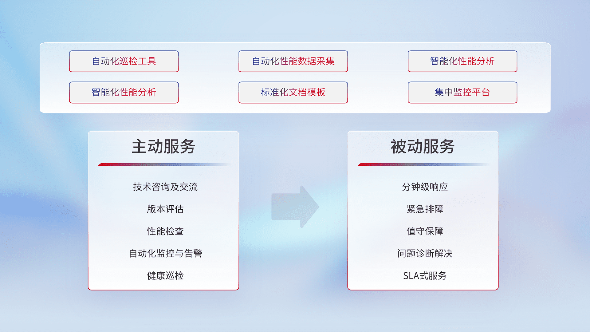 智能化工具和标准化文档,,,保障服务质量,,,提供主动服务(包含技术咨询、、、、版本评估、、、、性能检查、、、自动化监控与告警、、、、健康巡检)和被动服务包含(分钟级响应、、、、紧急排障、、、、值守保障、、、、问题诊断解决、、、SLA服务)。。。